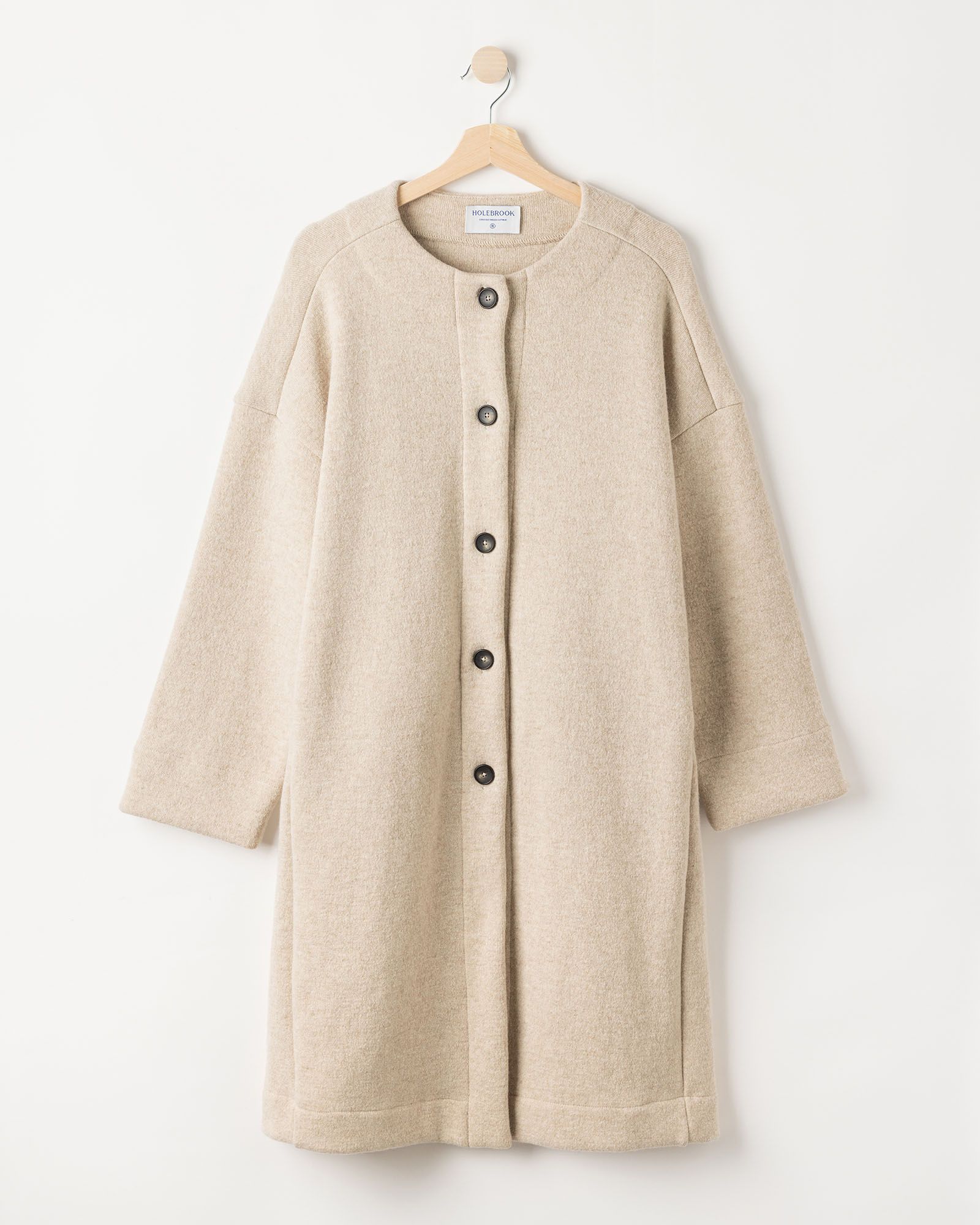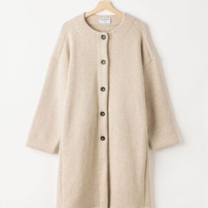 Gestrickter kragenloser Mantel aus Wollmischung. Rundhalsausschnitt. Oversize-Passform und überschnittene Schultern. Fünf Hornknöpfe vorne und seitliche Taschen.Nachhaltig produziert in Europa.