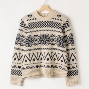 Jacquard-Strickpullover aus weicher Merinowollmischung mit traditionellem Muster. Normale Passform mit Rundhalsausschnitt und gerippten Abschlüssen. Nachhaltig in Europa produziert.